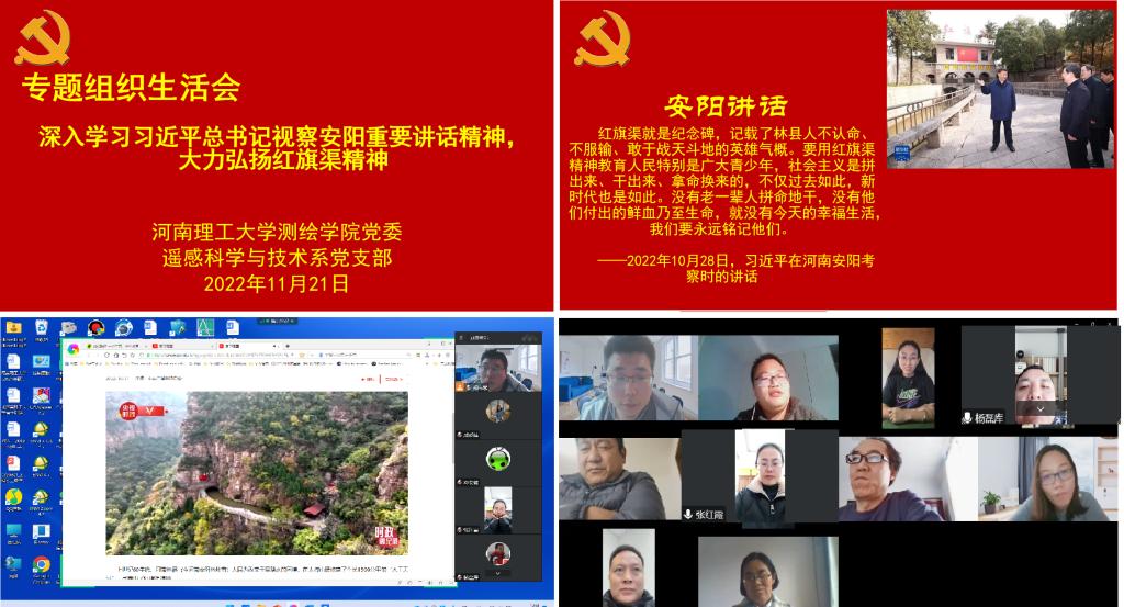 遥感科学与技术系党支部全体党员召开了“深入学习习近平总书记视察安阳重要讲话精神,大力弘扬红旗渠精神”专题组织生活会,院党委书记张红霞以普通党员身份参加学习研讨。