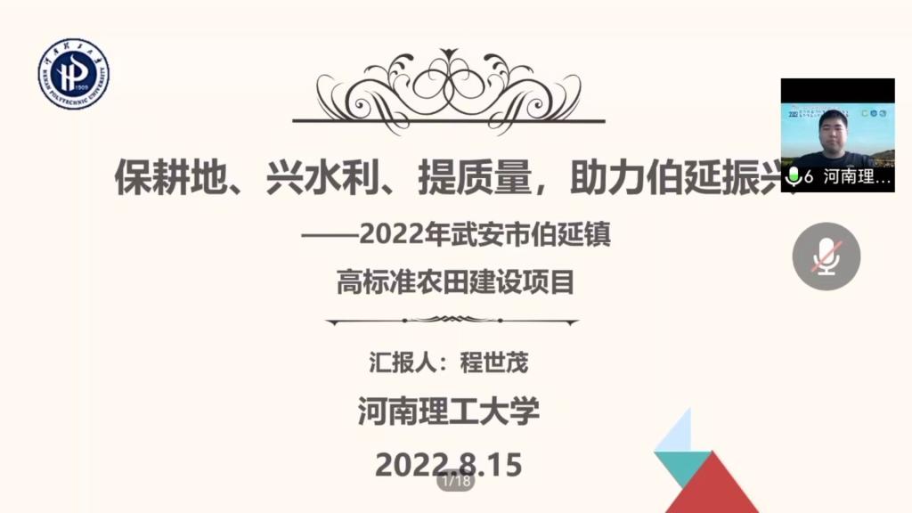 专业教师傅建春指导,土管系19级学生程世茂、王虎、谭佳乐组成的队伍,围绕《保耕地、兴水利、提质量,助力伯延振兴——2022年武安市伯延镇高标准农田建设项目》;由朱帅蒙、王宇共同指导,土管系20级学生刘向阳、秦璐、赵淑贤、赵钰铎组成的队伍,围绕《拥万亩良田,饮一池碧水,幸福美丽新乡村——信阳市浉河区4个村土地整治》报告内容,经线上作品汇报、专家质疑等环节的激烈角逐,最终分别荣获二等奖和三等奖。