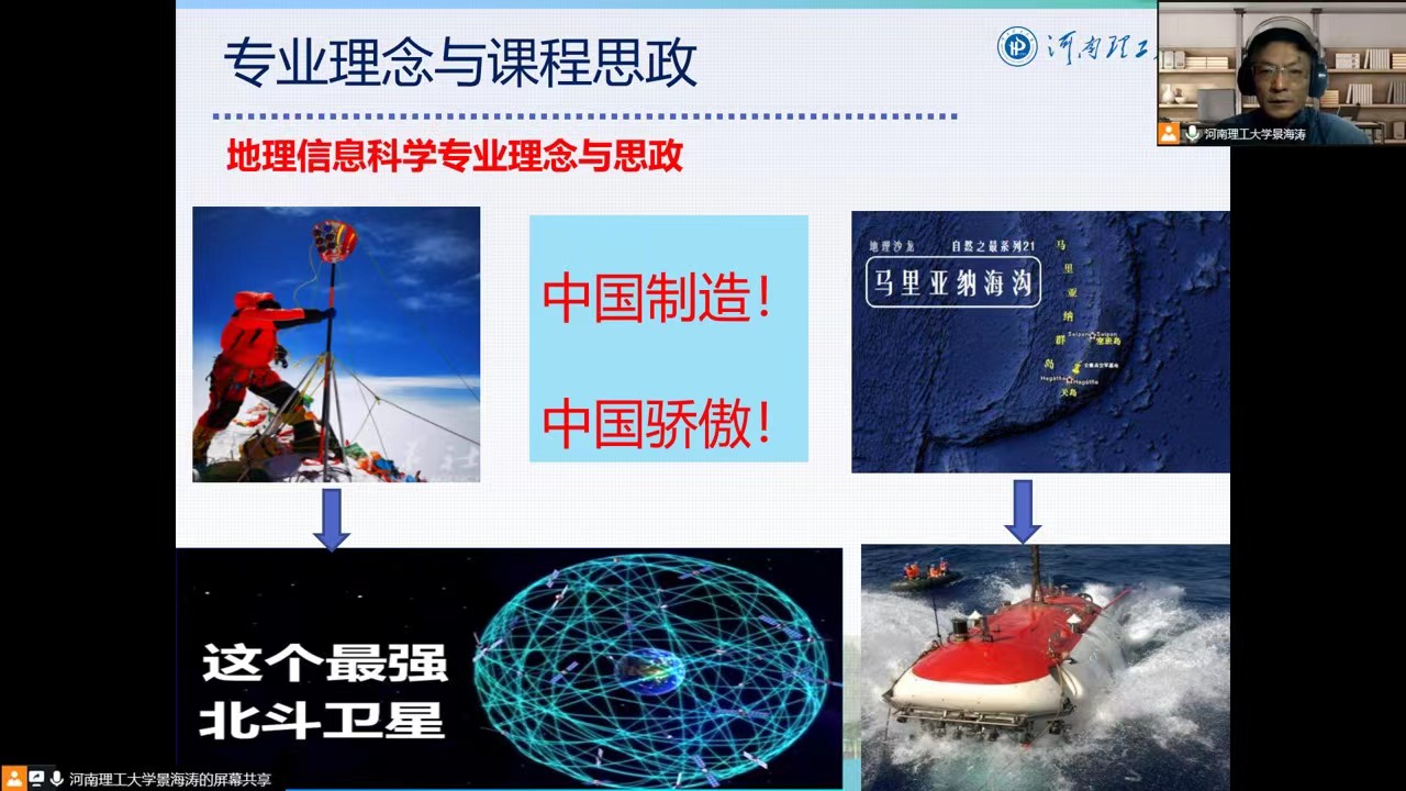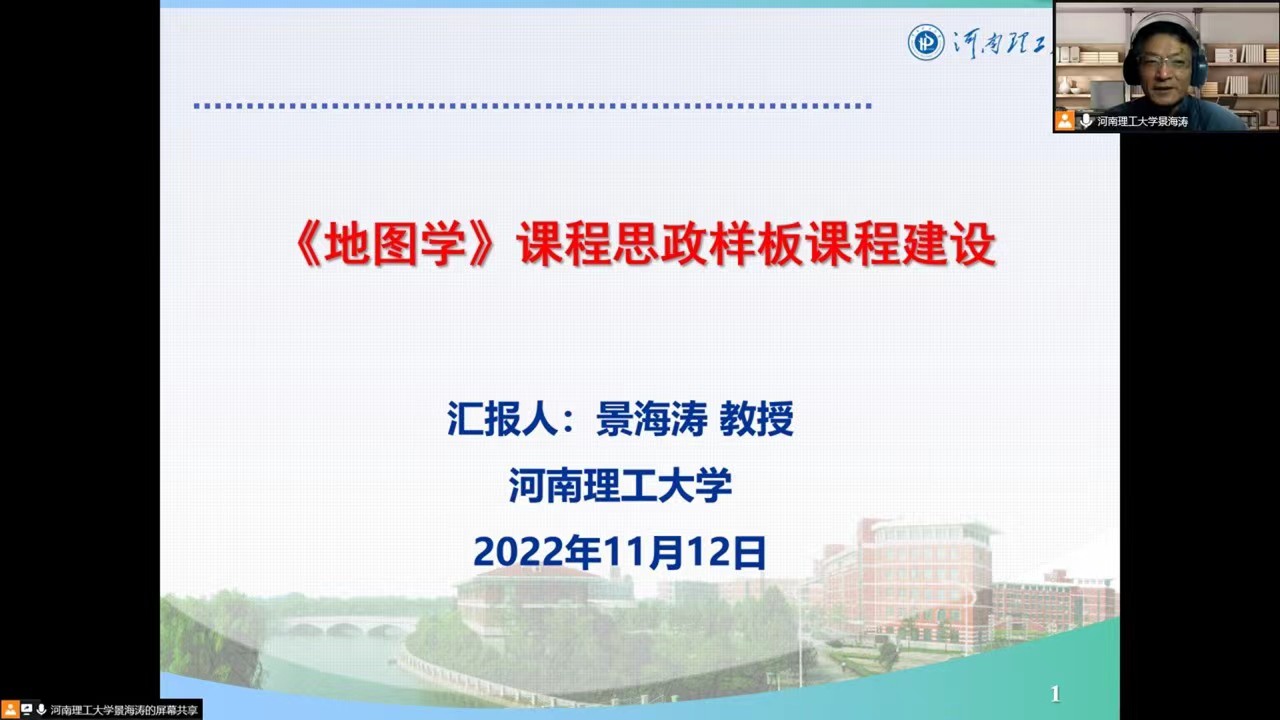 相关专业教师在线参加专题研讨并踊跃发言。在“地理信息科学专业课程思政建设研讨会”专题中,景海涛教授做了题为“《地图学》课程思政样板课程建设”的专题报告,以河南省首批课程思政样板课程《地图学》为例,从专业理念与课程思政、地图学课程思政、课程思政实验案例库建设等方面介绍了红杏视频