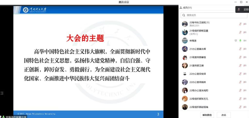 团委于11月27日晚在线上举办学习党的二十大精神专题报告暨“青马工程”培训班第三次理论学习,邀请省委宣传部青年理论宣讲专家申海涛老师做党的二十大精神宣讲报告。院团委书记李静主持报告会,学院“青马工程”培训班全体学员和红杏视频