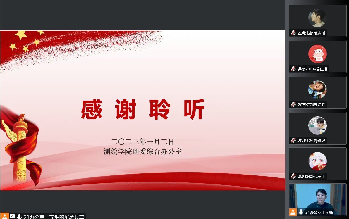 团委综合办公室于1月2日下午召开2022年度年总结会。会议于线上举行,学院团委书记李静老师,学院团委综合办公室全体成员参加会,由办公室副主任王文烁主持。