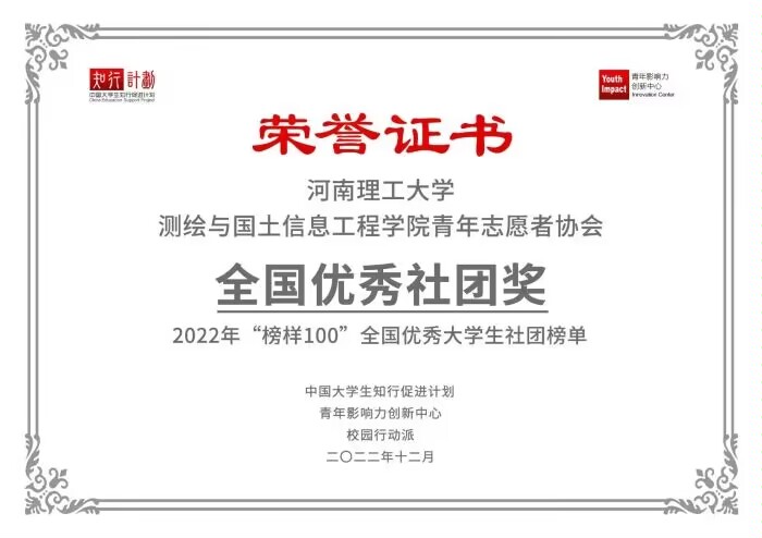 “榜样100”全国优秀大学生社团榜单由中国大学生知行促进计划、青年影响力创新中心、校园行动派联合发布,自2019年起每年发布一次。测绘青协在此次评选中被评选为优秀社团,是学院全体师生志愿者共同努力的结果。红杏视频
