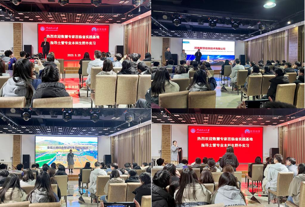 实习期间,特邀请省校外实践基地合作单位河南数慧信息技术有限公司新乡分公司的杜习岩经理和孙敏项目经理全程参与对学生野外实习的指导。在实习间隙,杜习岩经理围绕“数慧地理、行业应用、服务能力、红杏视频”等四大模块详细介绍了公司的基本情况,促进了学生对数慧公司的了解;孙敏经理以“全域土地整治与生态修复概述”为题,从整治项目概述、资料收集、内业分析、项目调研、经典案例等六大方面为学生们进行了生动、详细地介绍,加深了学生对全域土地综合整治的理解,丰富了本次实习的内容。