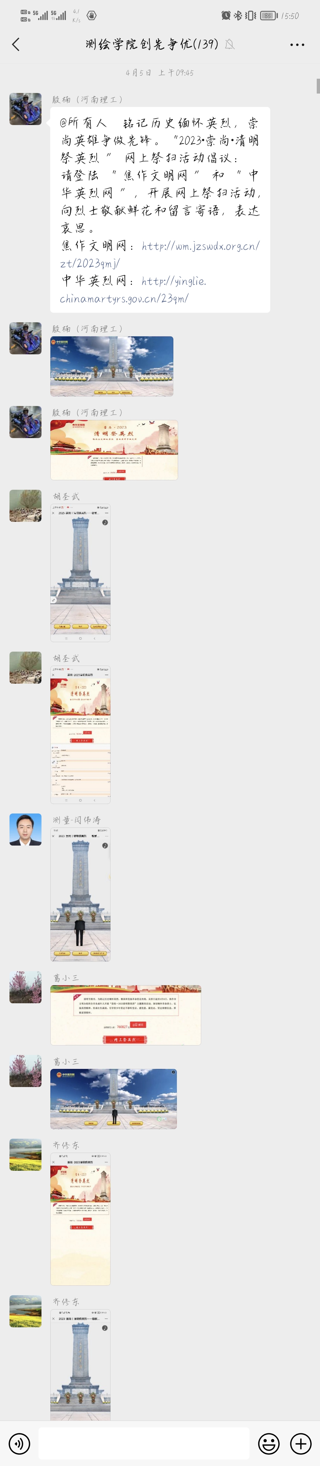 全体教师积极响应,登录中华英烈网、焦作市文明网等平台,进行线上祭扫,并向烈士敬献鲜花,留言寄语表达深情缅怀和无限思念。