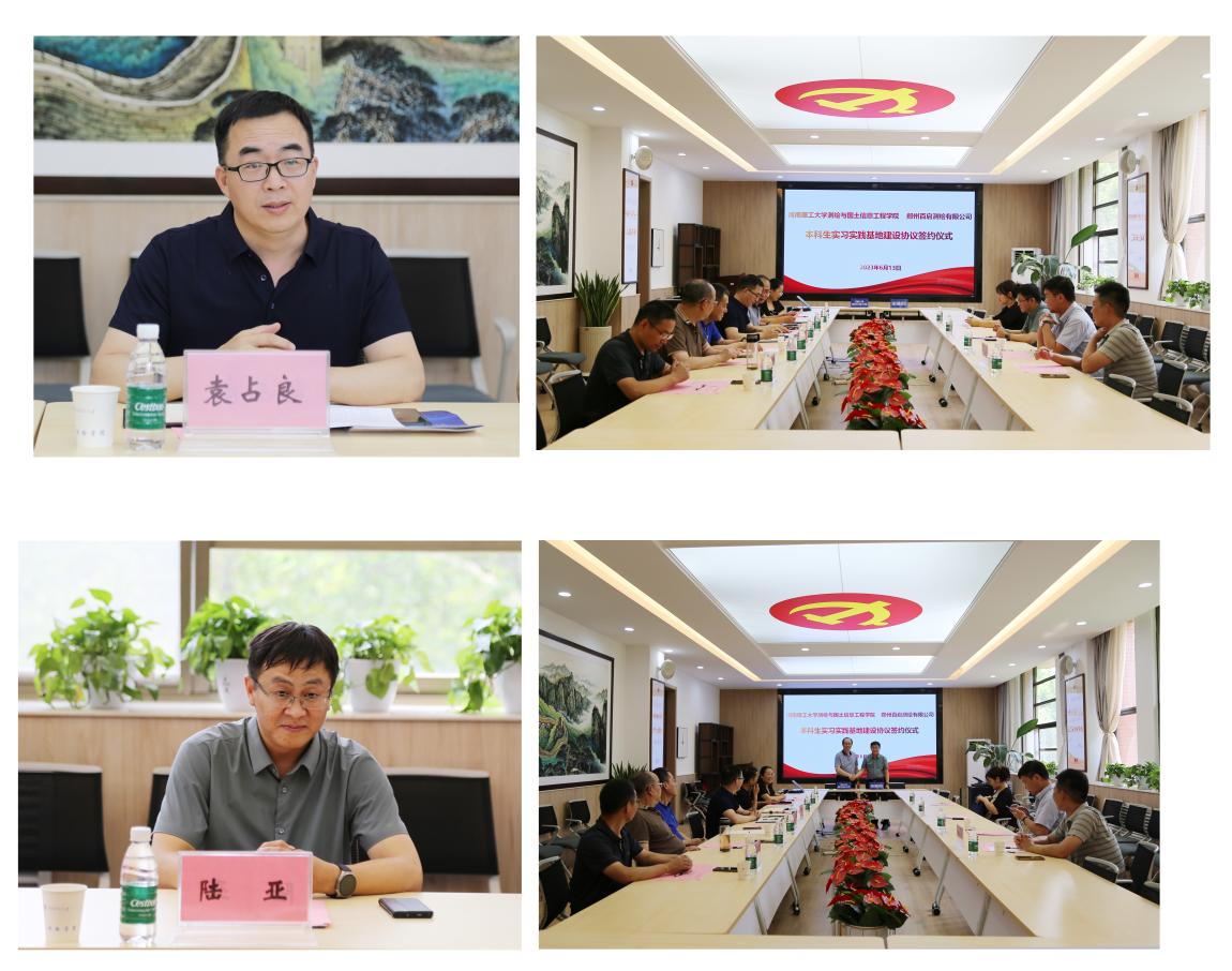 袁占良代表学院对陆亚等一行的到来表示欢迎,并简单介绍了学院的发展历程、学科建设、近年来所取得的主要成绩等方面的基本情况,着重介绍了测绘科学与技术学科建设情况。他表示,此次实习实践基地建设协议的签订,必将进一步促进产教协同育人体系的作用发挥,助力学校紧密结合产业需求,提升学生实践创新能力。