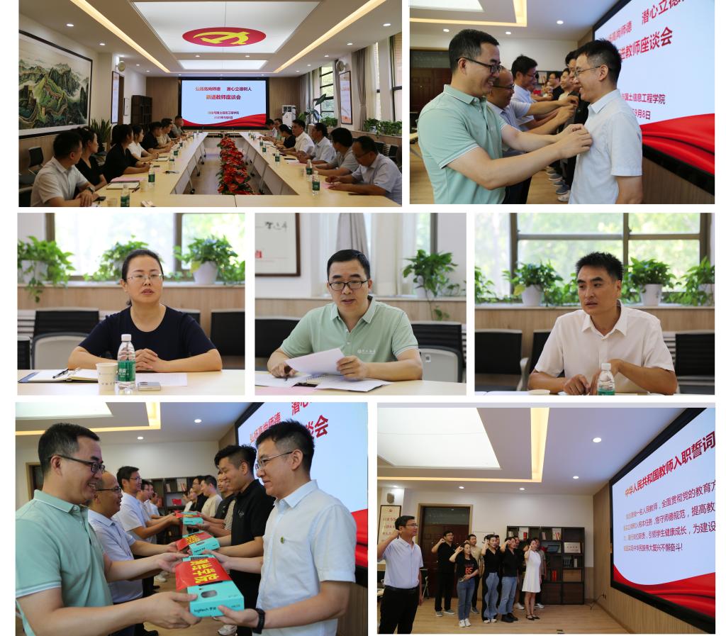 座谈会上,指导教师为新进教师佩戴校徽以及发放慰问品,这一仪式不仅象征着好学力行校风的接力与传承,也表达了学院对新教师的关心和支持。紧接着,新进教师集体宣誓,郑重承诺为教育事业的发展贡献力量,坚守师德规范,培养学生的全面成长,为教育强国建设而努力奋斗。