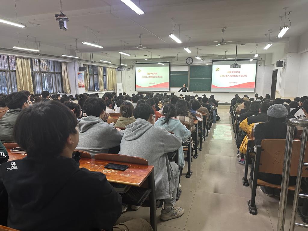 党委于南校区3102教室举办2023年入党积极分子培训班开班仪式,仪式由学院党委书记张红霞主讲,党委副书记郭学鹏、组织员李晶晶、学工办主任丰习才和265名入党积极分子参加。