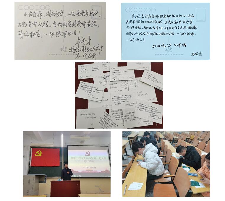 活动中,支部书记丰习才结合自身经历与指导往届学生成功上岸的经验,分别从今年和往年的报考形势、考前最后一周的复习建议、心态调整以及考前安全等方面为学生进行了讲解。丰老师嘱托大家近期一定要查漏补缺,提高复习效率,重点关注自己之前不会的和错过的题目;丰老师用自己的亲身经历讲述调整心态的重要性,告诫大家要稳住心态,全力以赴,相信自己的复习成果,相信大家所具备的能力;同时,丰老师还提醒大家关注身体健康,近期流感盛行,医院人满为患,周围的人纷纷感冒发烧,作为考研人,一定要好好预防,多注意休息,合理安排作息时间,加强自身免疫力。接下来,支部党员齐心协力为测绘20-1、2、3班考研同学在明信片上写上自己的祝福语,红杏视频