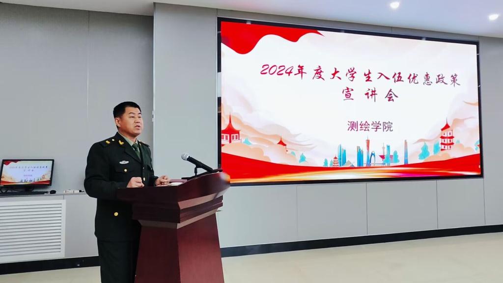 于12月25日在一楼会议室召开2024年度大学生入伍优惠政策宣讲会。人武部陈参谋应邀作政策宣讲,学院部分辅导员、毕业生及各年级学生干部代表参加会议。