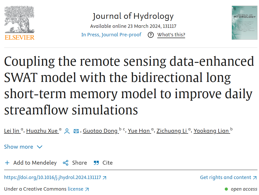 薛华柱老师课题组在《Journal of hydrology》期刊发表题为“Coupling the remote sensing data-enhanced SWAT model with the bidirectional long short-term memory model to improve daily streamflow simulations”的学术论文。文章通讯作者为薛华柱老师,第一作者为其指导的2021级测绘科学与技术硕士生金磊。《Journal of Hydrology》是水文水资源领域历史最悠久、最有影响力的国际期刊之一,目前为中科院一区top期刊。
