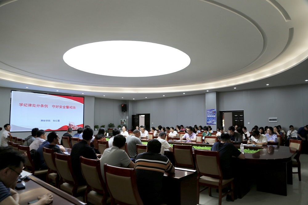 党委书记张红霞在一楼会议室以“学纪律处分条例 守好安全警戒线”为题,为学院全体教职工讲授专题党课。