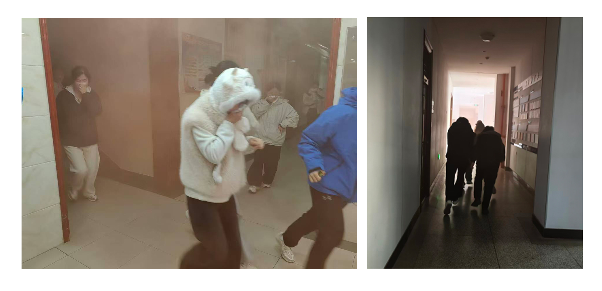 随着模拟烟雾升起与应急警报拉响,疏散演练分别在学院教学楼与学生宿舍区同步启动。全体师生在安全员的指引下,迅速用湿毛巾捂住口鼻,弯腰低姿,沿预定疏散路线快速、有序地撤离至安全集结区。整个过程组织严密、行动高效,达到了预期演练效果。