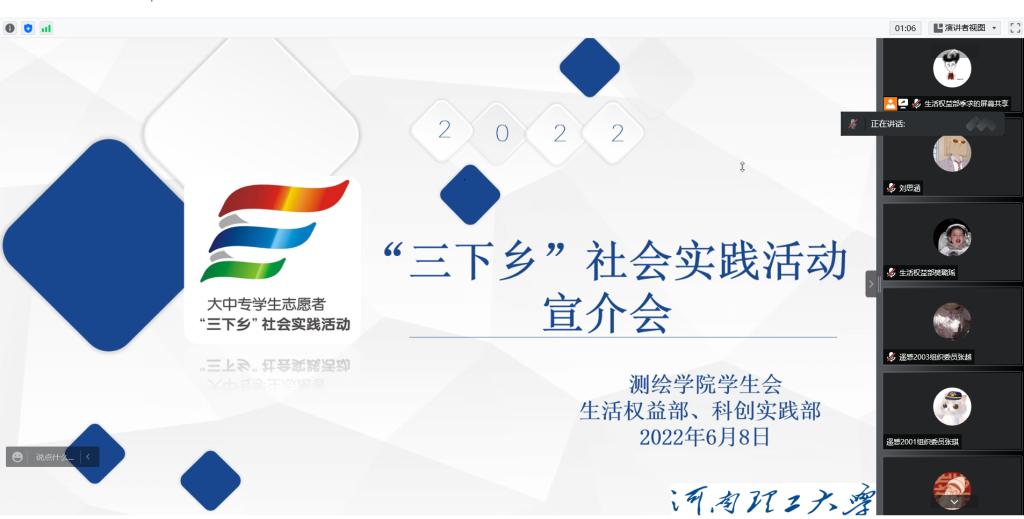 举办暑期“三下乡”社会实践活动线上宣介会,此次社会实践活动由院学生会生活权益部主办、科创实践部协助举办。2020级、2021级共计190余名同学参加了会议。