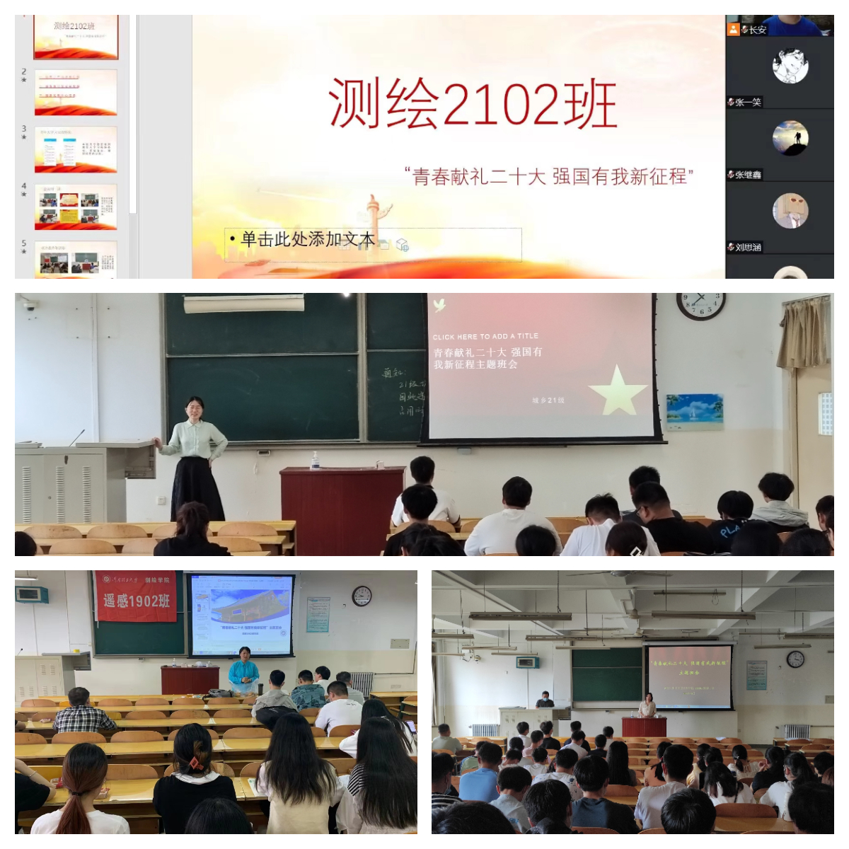本次主题班会由辅导员、班主任或学业导师通过线上会议、线下宣讲等形式灵活组织召开,紧紧围绕宣传习近平新时代中国特色社会主义思想、疫情防控常态化教育、生命安全教育、民族宗教政策法规宣传教育四个方面展开。老师带领同学们深入学习贯彻习近平新时代中国特色社会主义思想并重温党史,勉励学生坚定信念、勇担使命,在复兴伟业中接过新时代接力棒跑出新一代测绘青年的好成绩;结合当前疫情形势,进一步弘扬抗疫精神,教育引导同学们同舟共济,自觉遵守学校防疫规定,提升防控意识;关注学生心理健康,提升学生心理素质;积极宣传民族宗教政策法规,树牢法治思维,为加快建设国内一流特色高水平大学营造良好氛围、凝聚智慧力量。