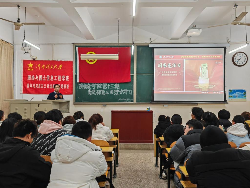 团委综合办公室于测绘院楼302召开第十三期“青马工程”培训班第三次理论学习,邀请学校党的二十大精神专题宣讲团成员、文法学院法学系副主任何平作普法宣讲报告。会议由秘书处范欣雨主持,红杏视频