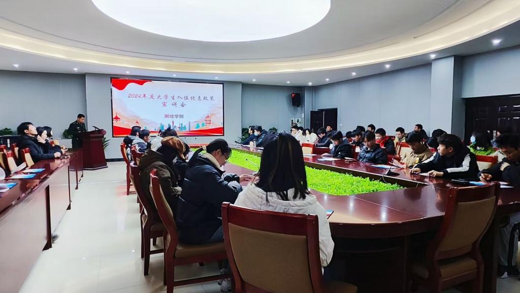 于12月25日在一楼会议室召开2024年度大学生入伍优惠政策宣讲会。人武部陈参谋应邀作政策宣讲,学院部分辅导员、毕业生及各年级学生干部代表参加会议。