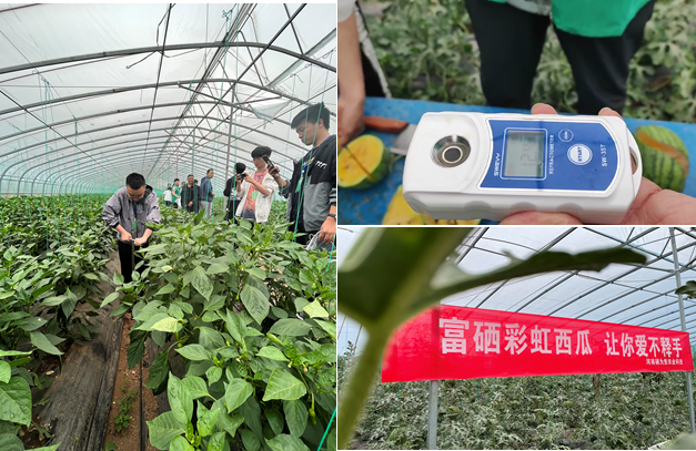 在河马仙果小镇,硒为贵公司董事长刘宗华、总经理杜军带着心有灵“硒”团队成员参观了富硒农业试验田,体验了富硒农产品西瓜和西红柿的分拣与包装,现场检测了富硒农产品的品质。其间,董事长刘宗华详细介绍了公司的基本情况和相关业务,她强调,富硒产业已经成为当地群众增收致富的重要渠道;硒为贵公司作为专业的富硒肥科技成果转化推广平台,在推广富硒肥大面积应用的同时,为客户提供富硒高端农产品电销、冷链运输、终端销售、农业金融服务等增值服务,希望院企双方以此次调研为契机,践行“绿水青山就是金山银山”理念,共同讲好富硒故事、做好富硒文章。带队老师朱帅蒙重点介绍了心有灵“硒”大学生创新创业团队近年来工作开展情况及获得成果,并从富硒土地开发利用、富硒产业发展等方面为硒为贵提出了意见建议。她表示,一直以来,心有灵“硒”团队始终秉持“发挥专业优势,服务区域特色,推动高质量发展”理念,致力于为地方经济发展贡献力量,此次调研,初步搭建了院企合作的平台,为接下来的深度合作打下了良好基础,下一步,双方可以拓展合作空间、扩大合作范围,进一步推动富硒产业的规模化、可持续发展,共同为乡村振兴赋能助力。