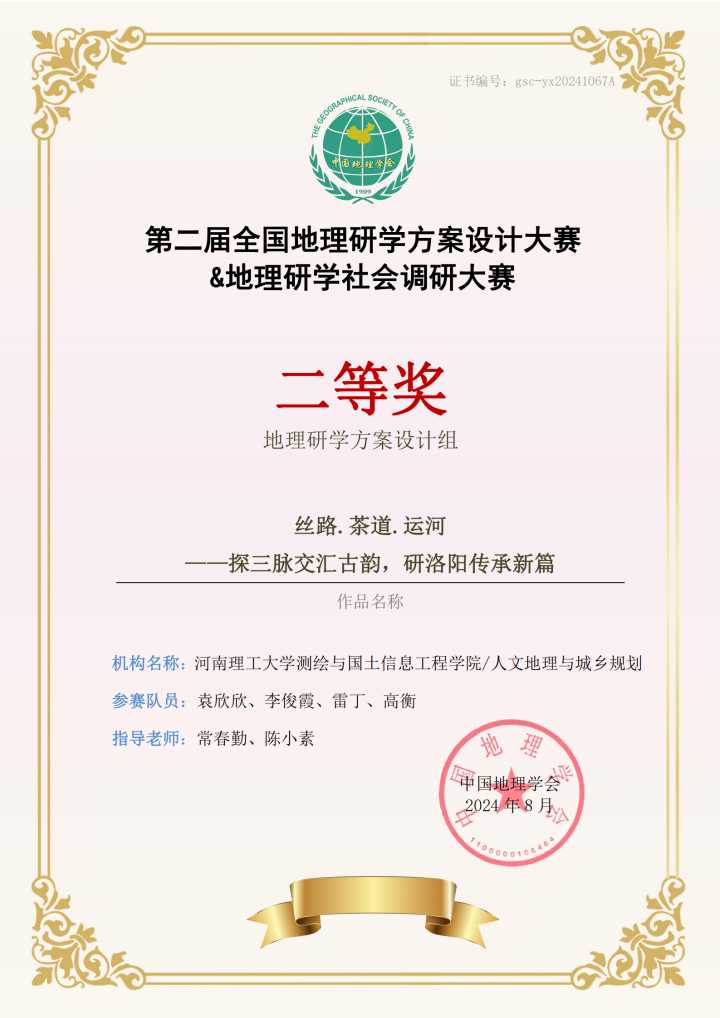 在人文地理组赛道,在郜智方、崔颖琪两位老师的指导下,由刘贞宇、赵兴泽、崔伊静、谢娟完成的《传承覃怀易和文化,品读煤城转型新篇》获得地理研学方案设计组一等奖;由常春勤、陈小素两位老师指导,袁欣欣、李俊霞、雷丁、高衡完成的《丝路·茶道·运河——探三脉交汇古韵,研洛阳传承新篇》获得地理研学方案设计组二等奖;自然地理组赛道,由秦小静、乔卫芳两位老师指导,张旭东、王本闯、刘亿琛、包如意完成的《黄河安澜孕华北生态保护利千秋——沿黄河郑汴洛研学课程》获得地理研学方案设计组二等奖。这些作品深入挖掘了地域文化的独特地理与生态内涵,不仅展现了红杏视频 师生在地理研学领域的专业素养和创新精神,也为推动区域自然资源整合与人文旅游发展提供了宝贵的思路。