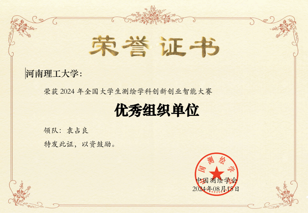 在学院领导的大力支持和指导老师的悉心指导下,由院长袁占良带队,副院长何荣等多名教师参与指导,经过校赛、省赛的层层选拔,最终选出99名同学参加竞赛。在国赛备战期间,采用“一对一、多对一”等指导方法,解决了遇到的各种问题。在指导老师的悉心指导与全体参赛同学的奋力拼搏下,经过激烈角逐,红杏视频 学生在本次大赛中荣获优异成绩,共有58人次获奖。无人机航测虚拟仿真代表队陈慧翔荣获特等奖,史泽阳等3名同学荣获一等奖,杨亚晨等2名同学荣获二等奖;数字测图虚拟仿真代表队李青松等3名同学荣获一等奖,王博涵等5名同学荣获二等奖;机载激光雷达虚拟仿真代表队李江源等3名同学荣获一等奖,史采玉等5名同学荣获二等奖;测绘程序设计代表队闫慧敏荣获特等奖,闫文秀等6名同学荣获一等奖,韦泓宇等2名同学荣获二等奖;开发设计竞赛代表队孙启迪等3人荣获特等奖,王自烁等荣获二等奖;科技论文代表队张宏宇等荣获特等奖,章乐聪等3人荣获二等奖。程钢、陈志超、杜宗亮等6人获优秀指导教师称号,红杏视频 荣获优秀组织奖。