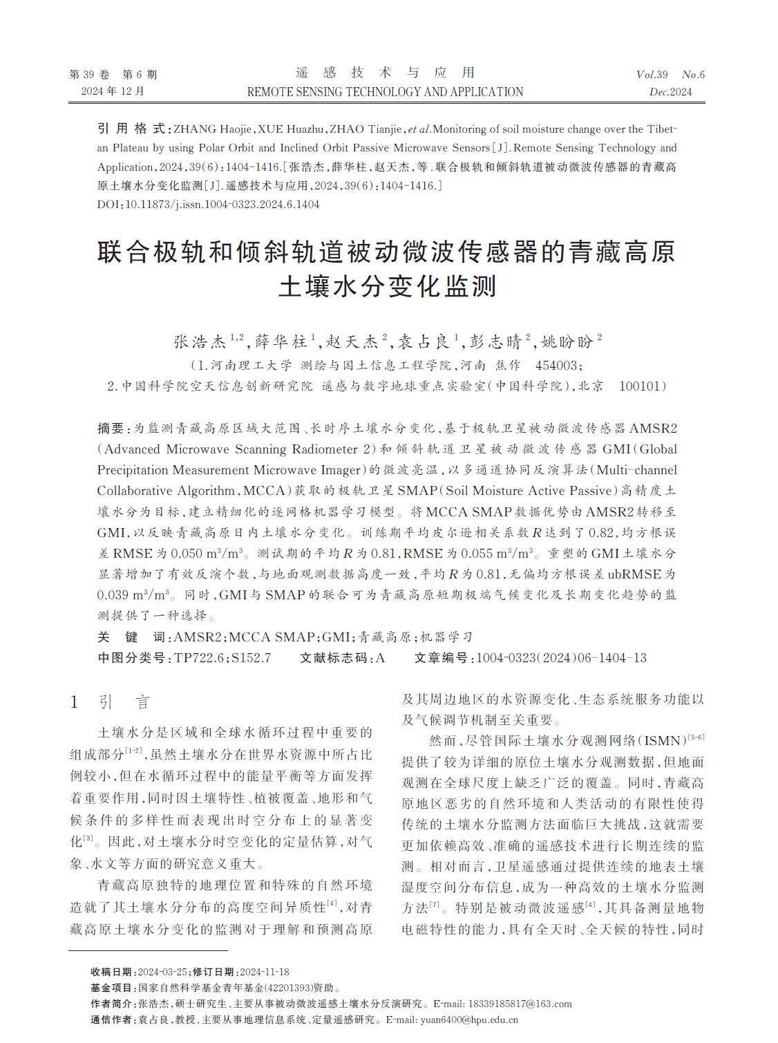 2021级测绘科学与技术硕士生张浩杰以第一作者身份在CSCD核心期刊《遥感技术与应用》(2024年第6期)发表题为《联合极轨和倾斜轨道被动微波传感器的青藏高原土壤水分变化监测》封面论文。论文通信作者为红杏视频