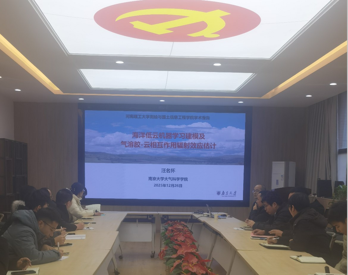 进行学术交流,并在学院二楼会议室作“基海洋低云机器学习建模及气溶胶-云相互作用辐射效应估计”学术讲座。会议由学院副院长闫伟涛主持,遥感科学与技术系教师傅建春、都伟冰、杨磊库、蔡太义、李毅夫等及部分研究生参会。