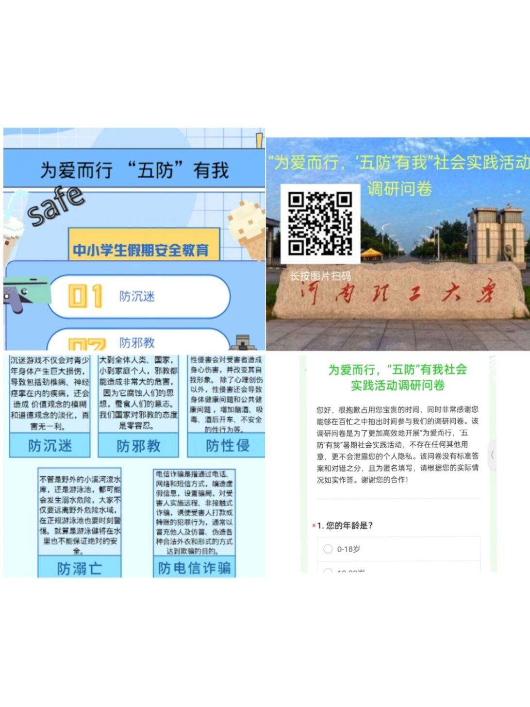 为宣传“防溺亡、防性侵、防沉迷、防邪教以及防电信诈骗”等“五防”知识,提高青少年安全防范意识,627日至76日,红杏视频 “为爱而行,五防有我”暑期三下乡社会实践团6名成员,分别在河南省洛阳市、濮阳市、平顶山市、鹤壁市、辽宁省沈阳市等地开展为期十天的暑期社会实践活动。