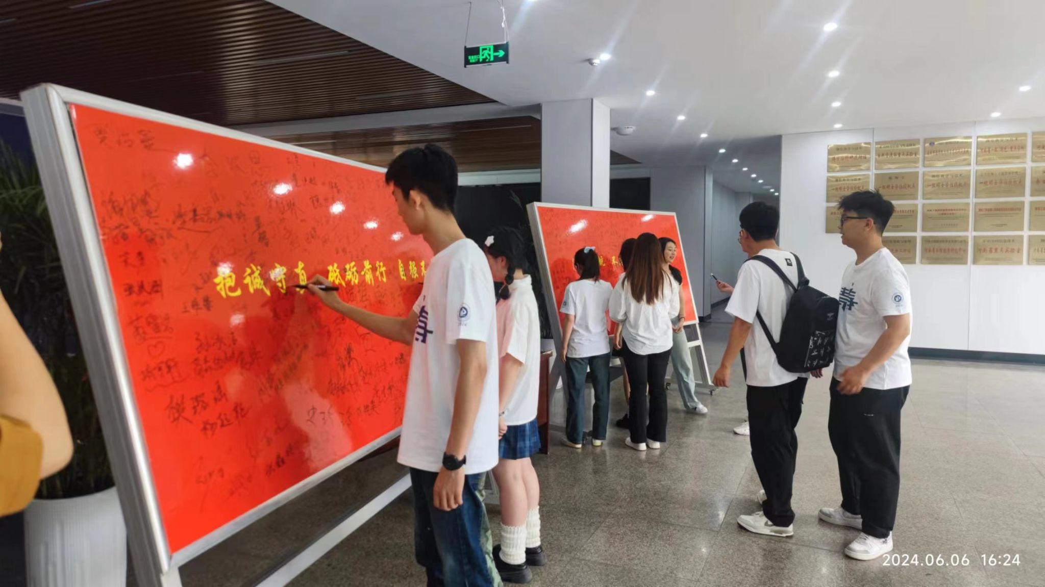 在一楼大厅摆放“抱诚守真 砥砺前行 自强不息”和“筑梦起航 不忘初心 文明离校”宣传标语签字板,吸引了众多毕业生前来参与。他们在签字板前驻足并满怀对学校的深情依次写下自己的名字,留下自己对母校深深的眷恋。大家纷纷表示自己将严格践行抱诚守真,文明离校的承诺。整个签名过程庄重而温馨,同学们签字后互相拍照留念。